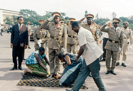 Sur cette photo historique, on voit Mobutu Sese Seko, qui a fait son second coup d’état, au président Joseph Kasa-Vubu. Il est entouré des officiers militaires, deux femmes cirent ses pompes, pendant que lui et les autres sont au garde à vous avec un salut militaire.