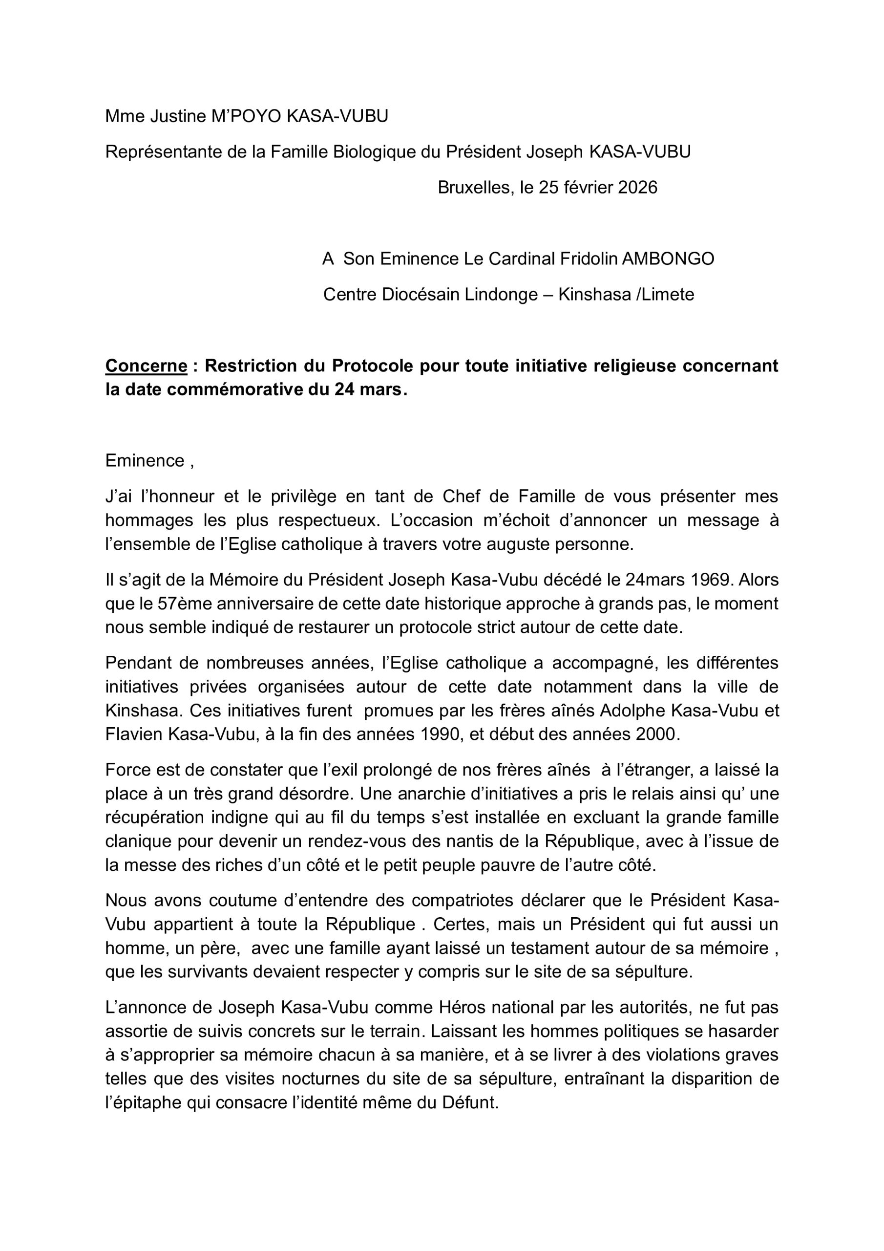 En ce jeudi 19 mars 2026, au moment où nous couchons ces lignes, l’église catholique romaine a été officiellement interpellée : le cardinal Fridolin AMBONGO ayant personnellement accusé réception de la lettre de Ma Justine M’poyo Kasa-Vubu.